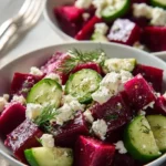 This beet salad is bright, fresh, and easy. It uses simple ingredients and comes together fast. You get sweet roasted beets, cool cucumbers, salty feta, and fresh dill in one bowl. It works as a side or a light lunch.