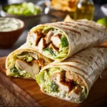 A quick and fresh Chicken Caesar Wrap featuring cooked chicken, crisp Romaine, creamy Caesar dressing, and Parmesan, all wrapped in a soft tortilla.