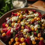 This salad mixes creamy feta, sweet beets, and hearty chickpeas. It tastes bright and feels filling. If you like sweet and savory salads, try a related creamy fruit salad like Snickers Caramel Apple Salad for a different treat.