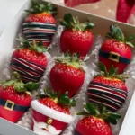 Fun and festive chocolate covered strawberries shaped like Santa, perfect for holiday gatherings.