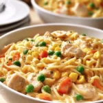A comforting dish that combines the flavors of traditional chicken pot pie with pasta, featuring tender chicken, veggies, and a creamy sauce.