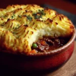 A comforting shepherd’s pie layered with savory meat and vegetables under creamy mashed potatoes, perfect for family dinners.