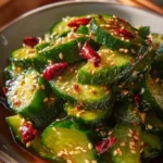 Salt the sliced cucumbers and chill to draw out water. Rinse and drain well so the salad stays crunchy. Mix sesame oil, soy sauce, sugar, rice vinegar, chili oil, sesame seeds, and garlic. Toss the cucumbers with the dressing and serve cold or at room temperature.