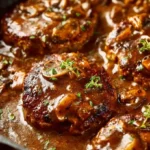 Make the patties first, brown them, then make the mushroom gravy in the same skillet. Cook the patties in the gravy so they stay moist. Simmer 15–20 minutes until cooked through and the sauce thickens.