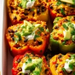 Serve the stuffed peppers hot from the oven. They make a great main dish and can be accompanied by a side salad or some tortilla chips. You can also offer different toppings on the side for everyone to customize their plates, such as avocado, salsa, or additional cheese.