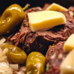 - Place the butter on top of the roast and add the pepperoncini peppers.