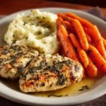 This meal is warm, simple, and full of flavor. You get juicy garlic herb chicken, creamy mashed potatoes, and sweet glazed carrots on one plate. It cooks fast enough for a weeknight and feels special enough for guests.