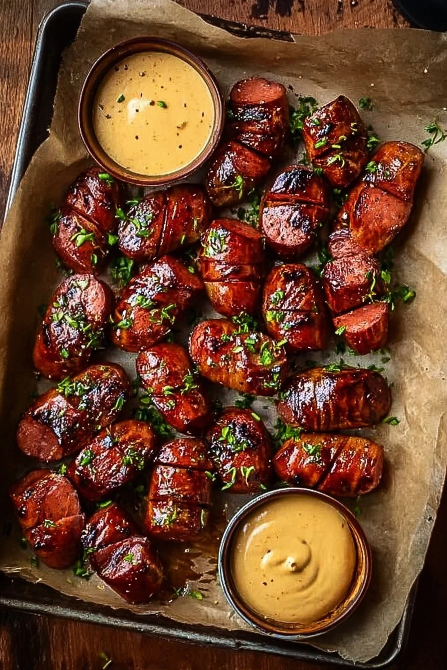 Savory kielbasa bites seasoned with tangy mustard and honey, perfect for parties and gatherings.