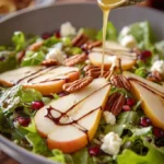 A light and fresh salad combining sweet pears, salty feta, and crunchy walnuts, all drizzled with a tangy balsamic vinaigrette.