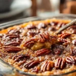 This cake is a true dump-and-bake recipe. You pour the pecan pie filling into a dish, sprinkle dry cake mix, add melted butter and water, and top with nuts. The oven does the rest. Watch the top so it turns golden and bubbly.