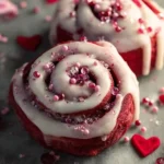 Soft and fluffy red velvet cinnamon rolls with a rich chocolatey flavor, perfect for Valentine’s Day celebrations.