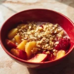 This Rhubarb-Peach Crisp is simple, fast, and full of flavor. The tart rhubarb and sweet peaches balance well. The oat topping gives a nice crunch. You can make it with fresh fruit in summer. It needs small time and few ingredients.