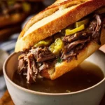 - Assemble sandwiches with shredded beef and pepperoncini, serving hot with optional au jus and giardiniera.