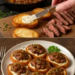 This recipe makes small crostini topped with thin steak slices, creamy horseradish sauce, and caramelized shallots. It uses simple ingredients and clear steps. If you enjoy bold flavors, you may also like this creamy beef and bowtie pasta recipe for another easy, rich dish.