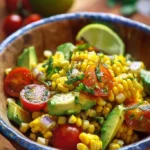 A bright and fresh summer salad made with sweet corn, ripe avocado, and cherry tomatoes dressed with lime.